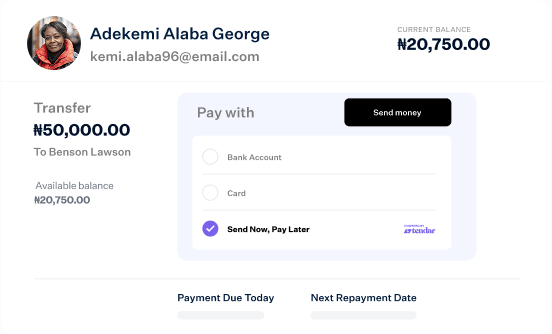 Give your users the power to send money anytime, even when funds fall short.With Tendar’s Send Now, Pay Later, you can boost engagement, increase transactions, and scale your business effortlessly.